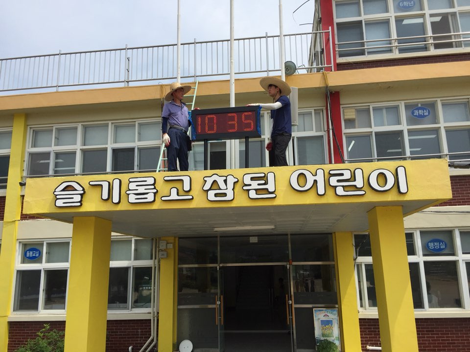 운동장 LED 디지털 전광시계 설치 전, 후 사진